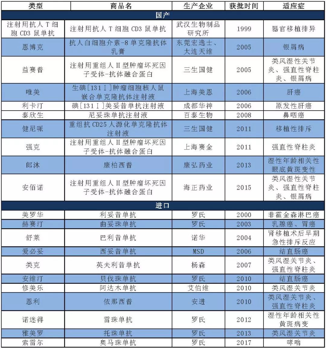 圖表2:國內(nèi)獲批上(shàng)市單抗産品彙總